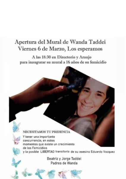 Decenas  de organizaciones sociales, comunitarias, de derechos humanos, así como también asociaciones de víctimas y familiares de femicidios,  invitan a toda la comunidad  a participar  activamente de la inauguración del Mural en homenaje a Wanda Taddei y a todas las víctimas de femicidios.