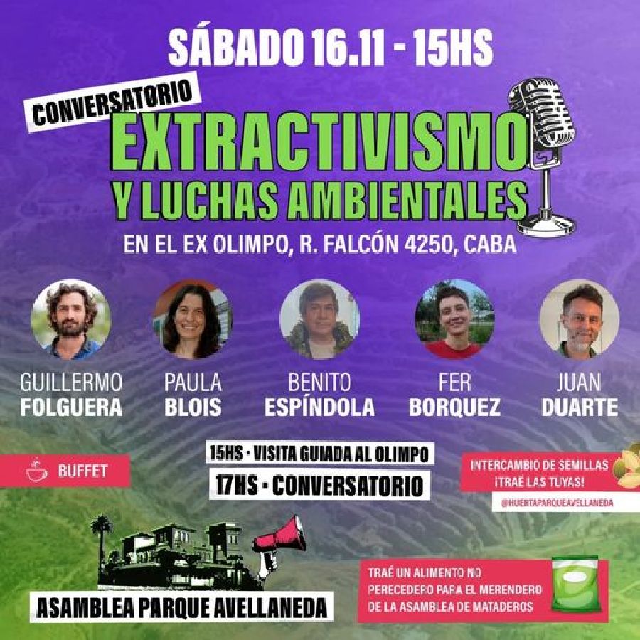 El próximo sábado   16 de noviembre a partir de las 15 hs. se realizará un conversatorio en el que se trataran temas tales como el entrecruzamiento  de los conceptos de identidad, soberanía y territorio en las luchas ambientales,  perspectiva de los pueblos indígenas y originarios, cómo se dan estas luchas en las  ciudades, qué impacto tiene el RIGI y cómo es el posicionamiento  contra las políticas extractivistas. Será a las 15 hs.  en el Ex Olimpo ubicado en  Ramón Falcón 4250 en el barrio de Floresta, previamente se realizará  una visita guiada al Ex Centro Clandestino de Detención, Tortura y Exterminio y  partir de las 17 hs. se iniciará el  conversatorio  con: Guillermo Folguera, Licenciado en Biología, Filosofía, Doctor en Ciencias Biológicas y coautor del libro “Veneno”, Paula Blois, Licenciada en Ciencias Antropológicas, Doctora en Antropología y coautora del libro “Veneno”, Benito Espindola, abogado del Pueblo Diaguita Kalchaqui, miembro de ORCOPO (Organización de Comunidades de Pueblos Originarios) y de la AADI (Asociación de Abogados/as de Derecho Indígena), Fer Borquez, Magister en Ambiente y desarrollo sustentable (UnQui), Lic. en Biología (UBA), coordina proyectos ambientales comunitarios y es educadorx ambiental y vecine de Parque Avellaneda, Juan Duarte, editor de la sección ecología de LID+ y de Ecología y Marxismo en Ediciones IPS, coautor del libro Extractivismos en Argentina (en prensa) y militante del PTS.